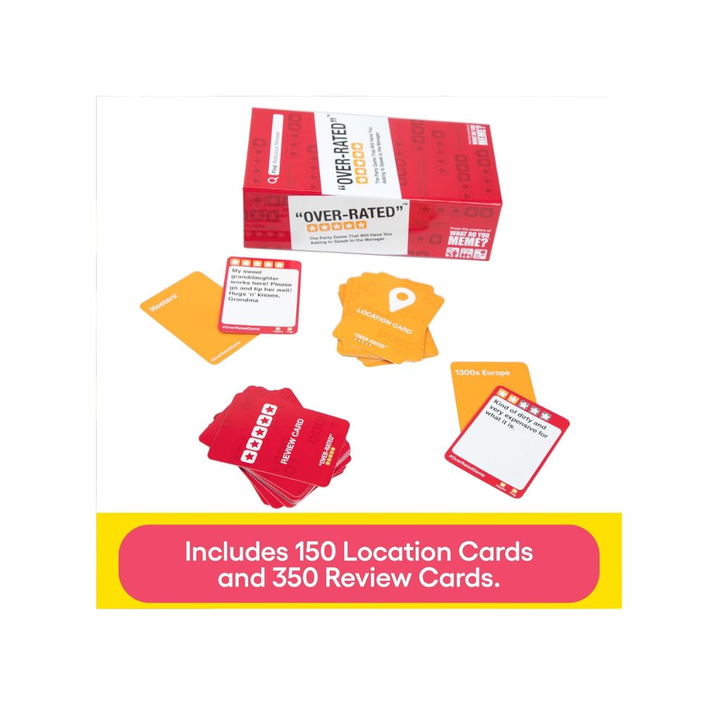 Over-Rated is a laugh-out-loud adult party card game where players compete to create the funniest and most outrageous ratings. Each round, players combine different cards to rate hilarious topics, from everyday situations to absurd scenarios.